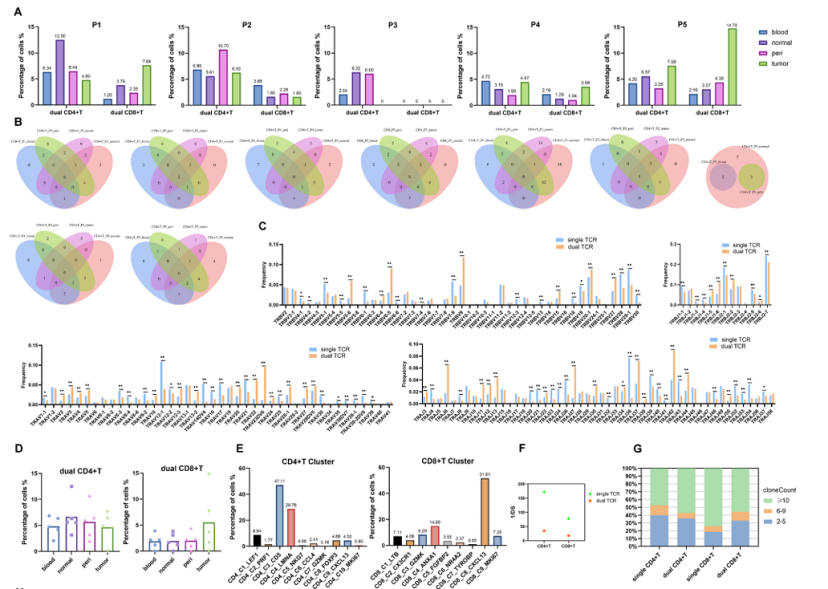 单细胞测序技术的发展为“双TCR T细胞”的深入研究带来了突破(Yao, et al. Cell death & disease,2023),课题组利用scRNA-seq和scTCR-seq优势,在GEO共享的非小细胞肺癌患者(NSCLC)研究队列数据中(He,et al. Cell Research, 2022),发现患者的血液、肿瘤周围正常组织、肿瘤周边组织和肿瘤组织中均存在一定比例的“双 TCR T细胞”,并表现出克隆性增生;不同组织部位“双 TCR T细胞”的CDR3存在部分重叠,提示其从血液迁移到肿瘤组织部位的特征;同“单TCR T细胞”对比,“双 TCR T细胞”在多个V、J取用家族上存在显著差异,提示其可能针对不同的肿瘤抗原表位(参与应答或调控);肿瘤组织中的“CD8+CXCL13+双 TCR T细胞”表现出更高比例的克隆增殖,提示其可能参与了抗肿瘤应答;同时发现部分“双 TCR T细胞”的 TCR β CDR3序列,与原队列研究中发挥应答效应的“CD8+CXCL13+单TCR T细胞”和”CD4+CXCL13+T单 TCR T细胞”共享,提示其共同参与了抗肿瘤应答效应。