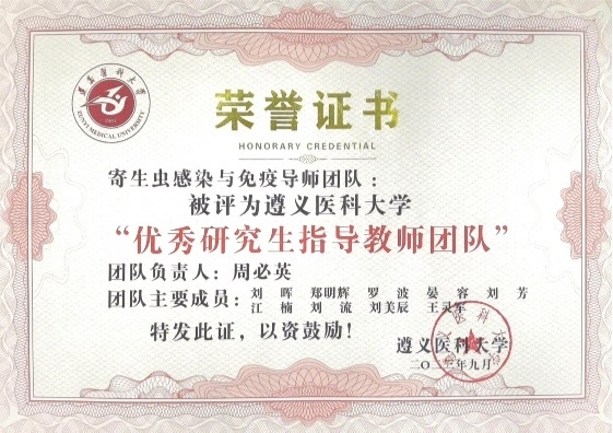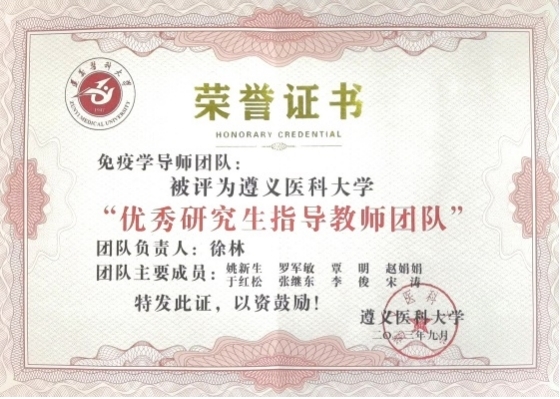 近日,公司发布了《威廉希尔williamhill官方网站关于表彰2020-2022年度优秀研究生导师、优秀导师团队的决定》(遵医校办发〔2023〕6号)文件,公司徐林教授领衔的“免疫学导师团队”和周必英教授领衔的“寄生虫感染与免疫导师团队” 获评威廉希尔williamhill官方网站“优秀研究生指导教师团队”;于红松教授、章涛教授、周必英教授、侯晓晖教授、杨加伟教授、徐德林教授、庹利教授获评威廉希尔williamhill官方网站“优秀研究生指导教师”。